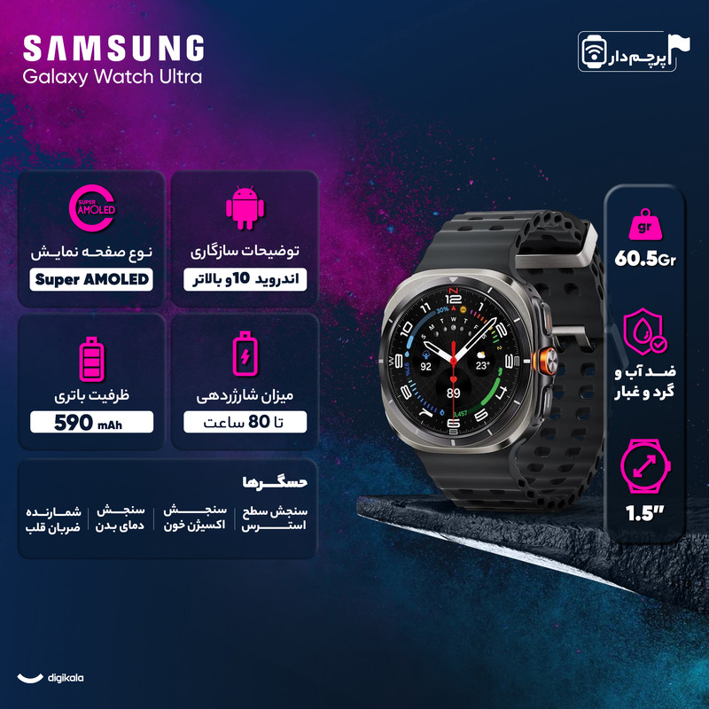 ساعت هوشمند سامسونگ مدل Galaxy Watch Ultra دارای قابلیت های کنترل موسیقی (Music Player)، قابلیت مکالمه از طریق بلوتوث، قابلیت تغییر طرح ساعت یا تم، صفحه همیشه روشن (Always-on Display)، پشتیبانی از دستیار صوتی بند سیلیکون