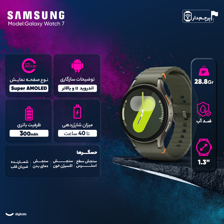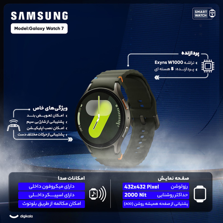 ساعت هوشمند سامسونگ مدل Galaxy Watch 7 40mm دارای قابلیت های کنترل موسیقی (Music Player)، قابلیت مکالمه از طریق بلوتوث، قابلیت تغییر طرح ساعت یا تم، صفحه همیشه روشن (Always-on Display)، پشتیبانی از دستیار صوتی بند پلاستیک