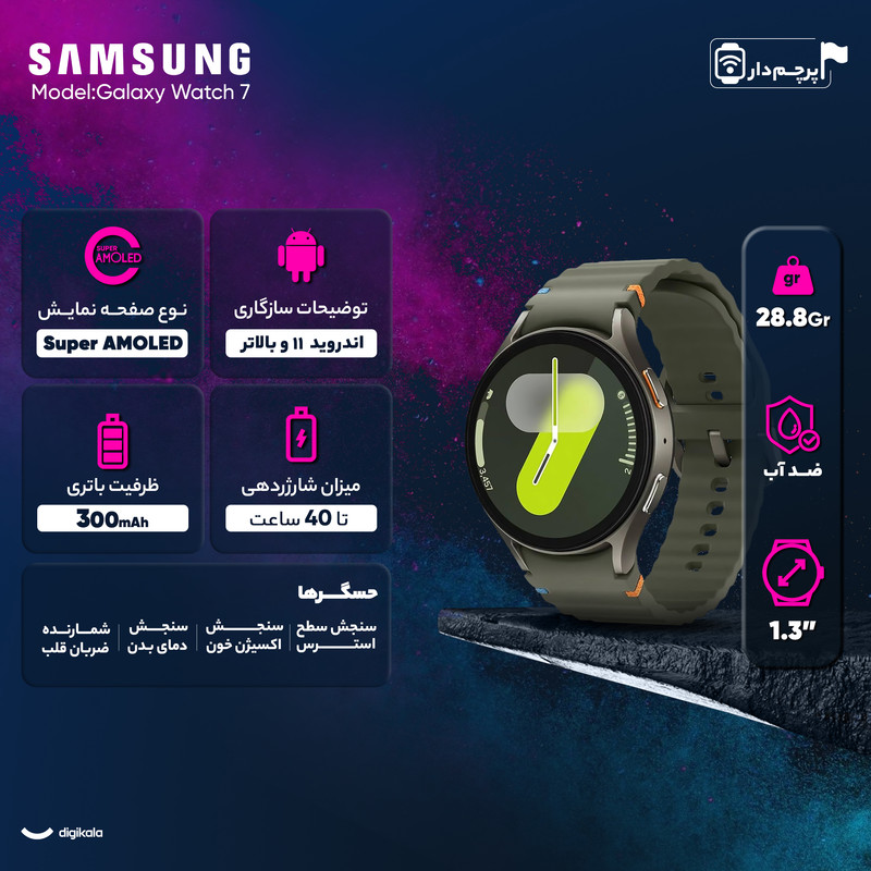ساعت هوشمند سامسونگ مدل Galaxy Watch 7 40mm دارای قابلیت های کنترل موسیقی (Music Player)، قابلیت مکالمه از طریق بلوتوث، قابلیت تغییر طرح ساعت یا تم، صفحه همیشه روشن (Always-on Display)، پشتیبانی از دستیار صوتی بند پلاستیک