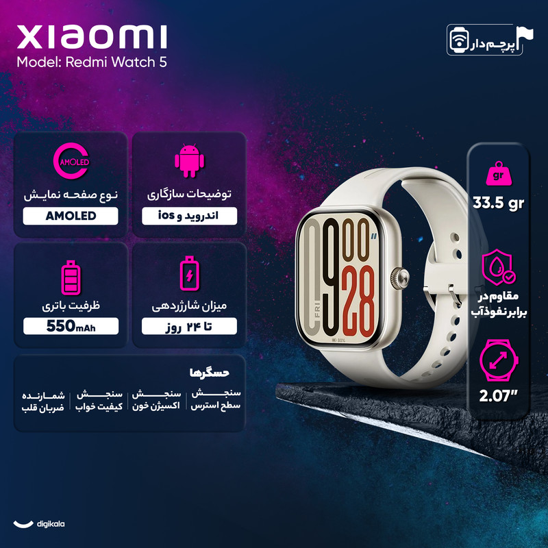 قابلیت های ویژه : مقاوم در برابر نفوذ آب تا عمق 50 متری / مجهز به دو میکروفون / دارای 150 حالت ورزشی