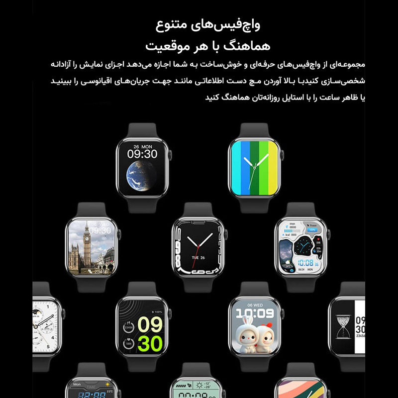 قابلیتهای ساعت هوشمند: کنترل موسیقی (Music Player) , قابلیت مکالمه از طریق بلوتوث , پشتیبانی از زبان فارسی در منو و سیستمعامل , قابلیت تغییر طرح ساعت یا تم