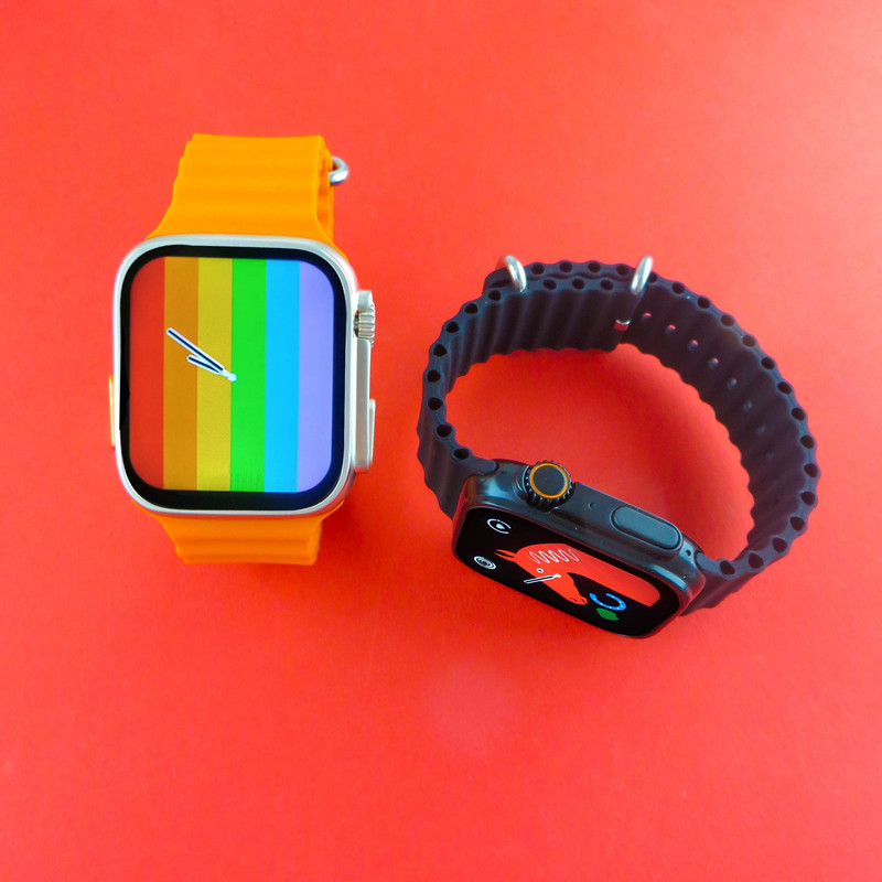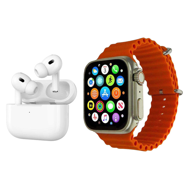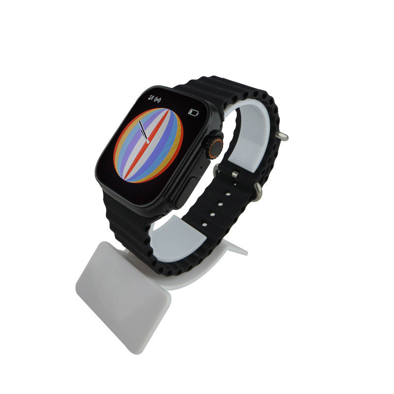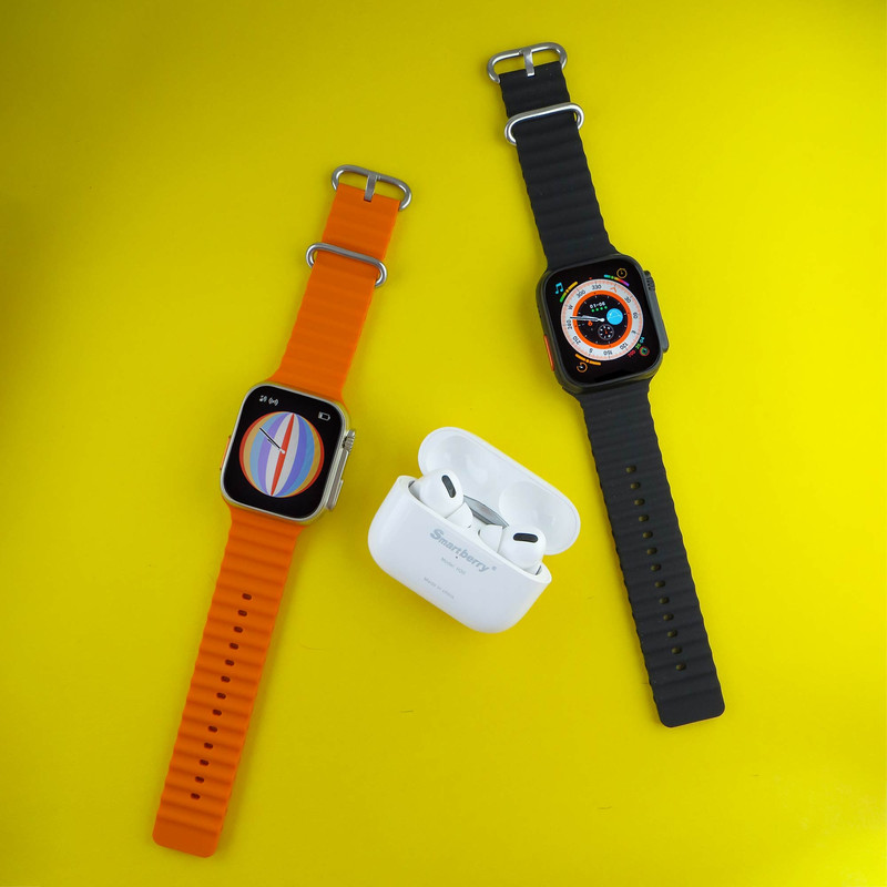توضیحات رنگ بند و بدنه : ساعت: فریم فلزی و بند سیلیکونی ocean با رنگ مشکی (به همراه بند سیلیکونی ساده اضافه) هندزفری: طرح ایرپاد پرو اپل سفید