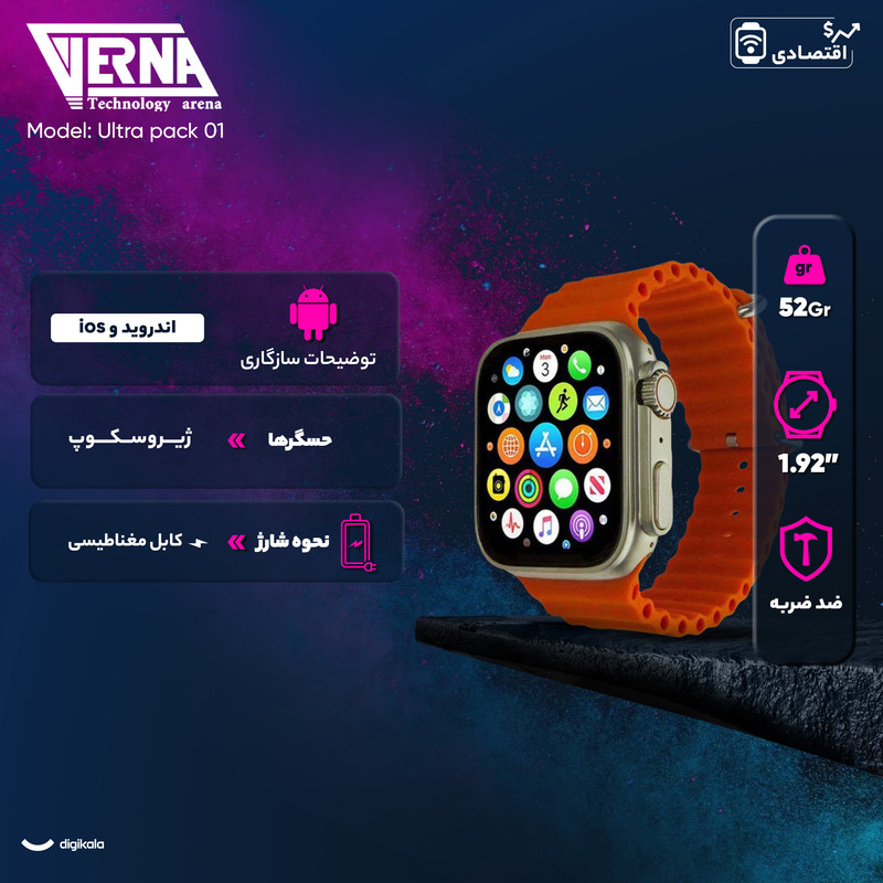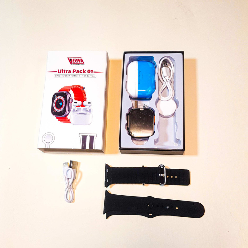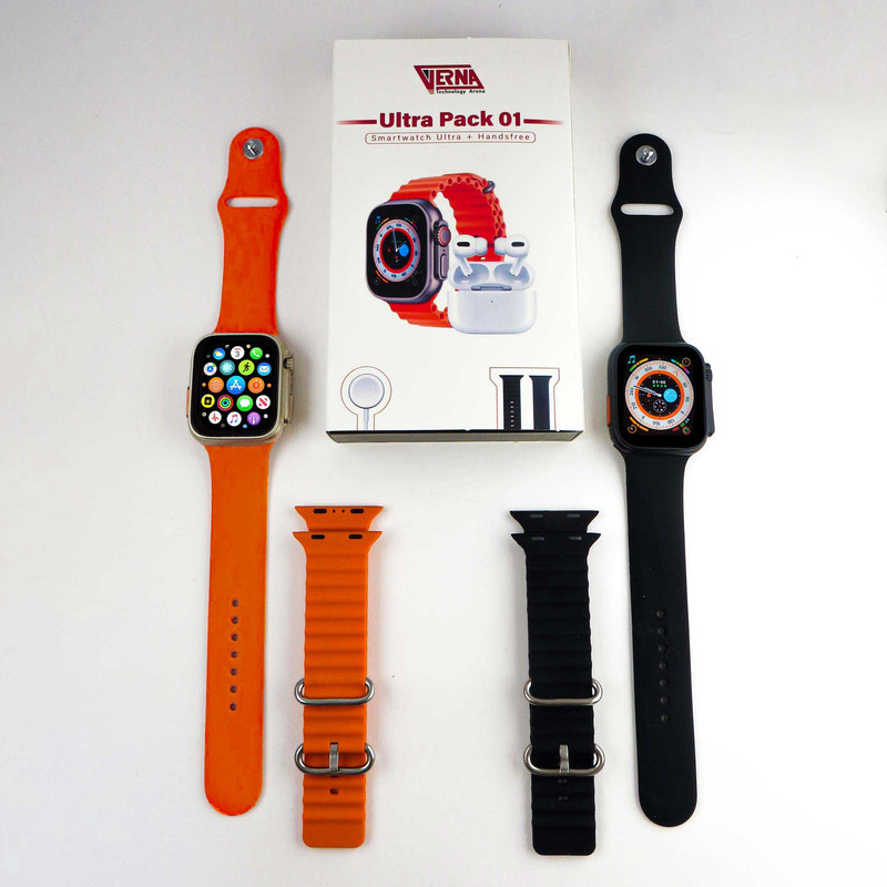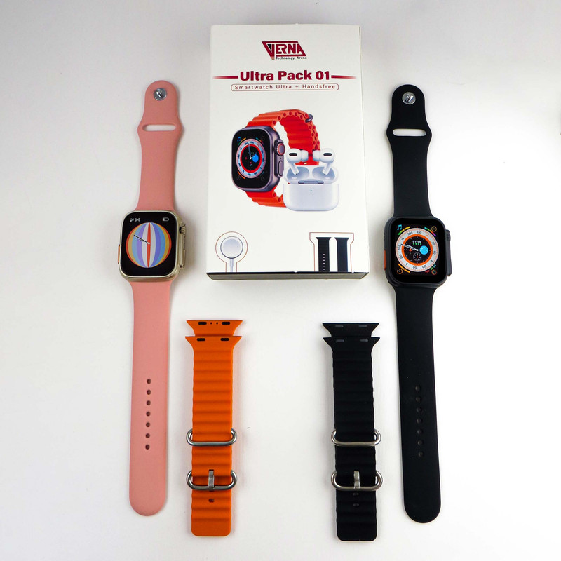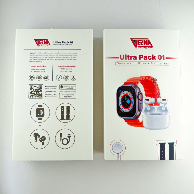 ساعت هوشمند ورنا مدل Ultra pack 01 به همراه هندزفری بیسیم دارای قابلیت های قابلیت مکالمه از طریق بلوتوث، کنترل موسیقی (Music Player)، پشتیبانی از زبان فارسی در منو و سیستمعامل بند سیلیکون