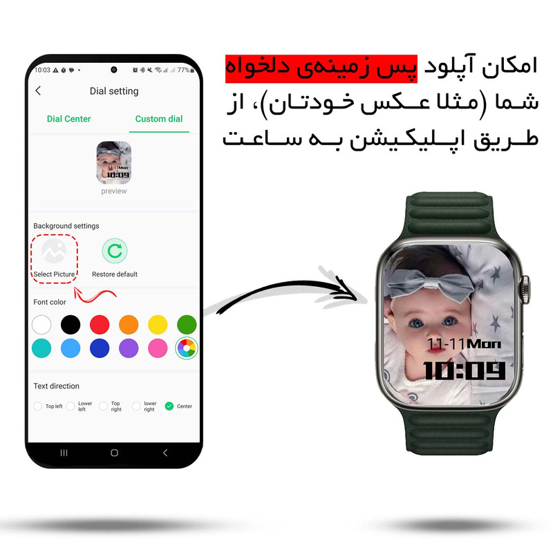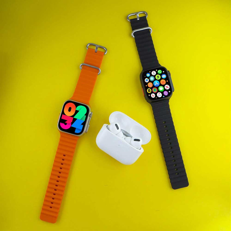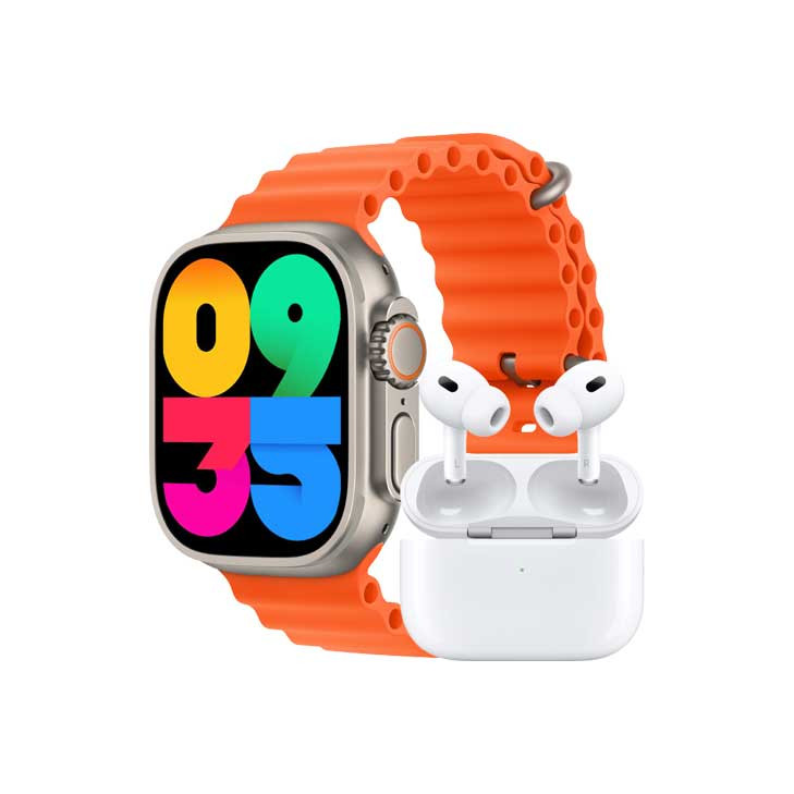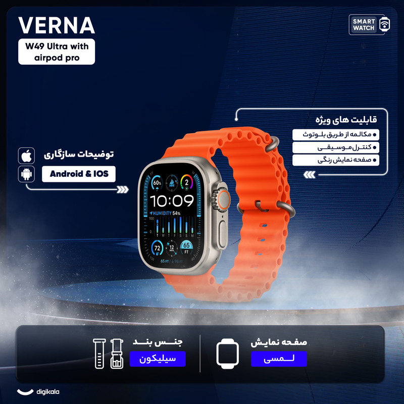 ساعت هوشمند ورنا مدل W49 Ultra with airpod pro دارای قابلیت های کنترل موسیقی (Music Player)، قابلیت مکالمه از طریق بلوتوث، پشتیبانی از زبان فارسی در منو و سیستم‌عامل بند سیلیکون