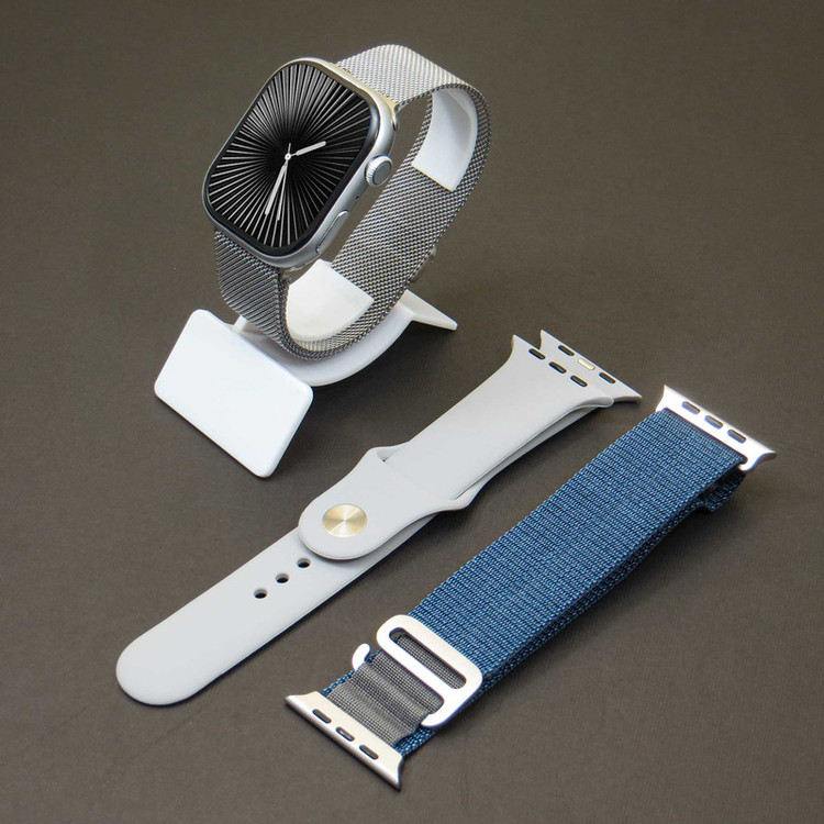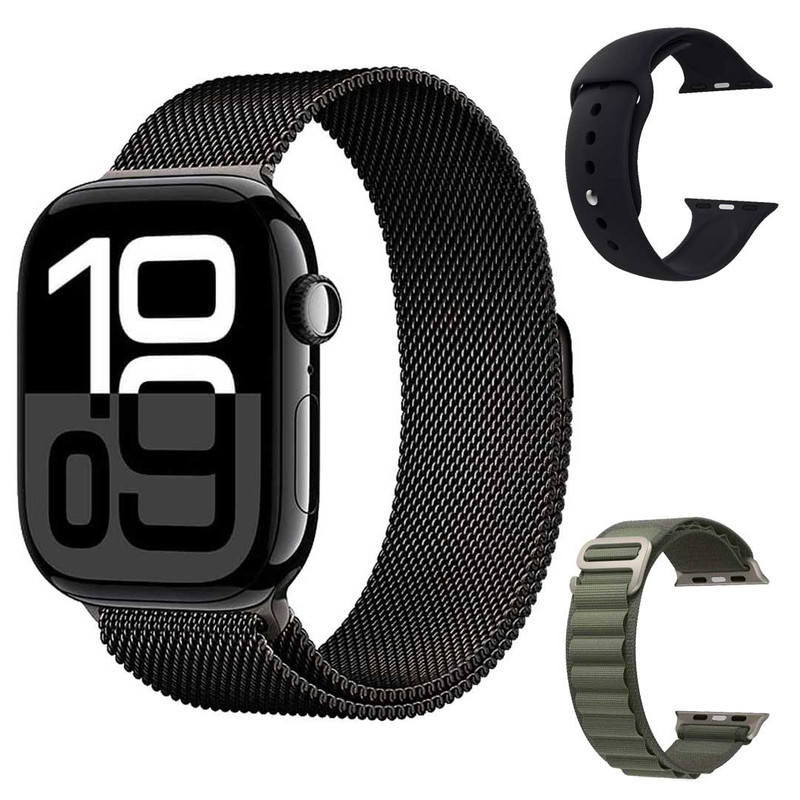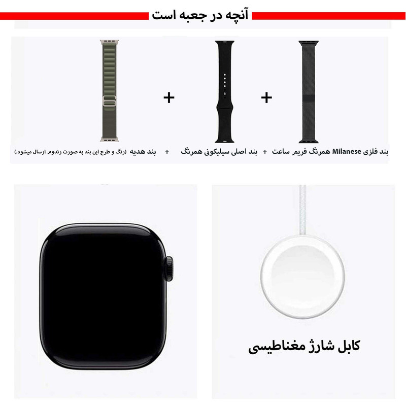 اقلام همراه : کابل شارژ وایرلس، بند فلزی میلانس همرنگ، بند سیلیکونی همرنگ، بند هدیه (رنگ و طرح این بند به صورت رندوم ارسال میشود)، کلگی شارژر کارت راهنمای فارسی