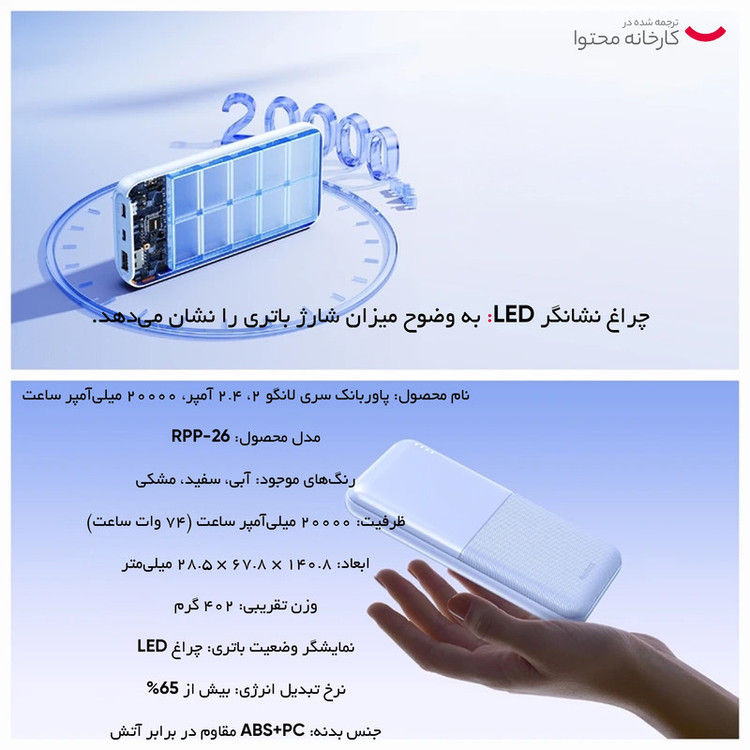 مشخصات فنی: ظرفیت 20000 میلی آمپر ساعت