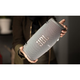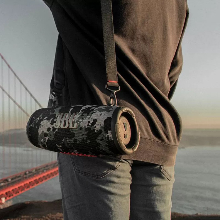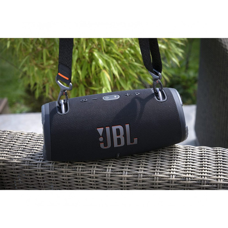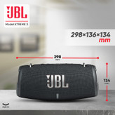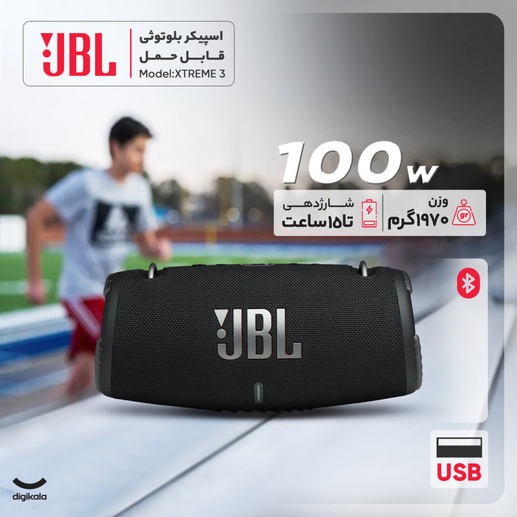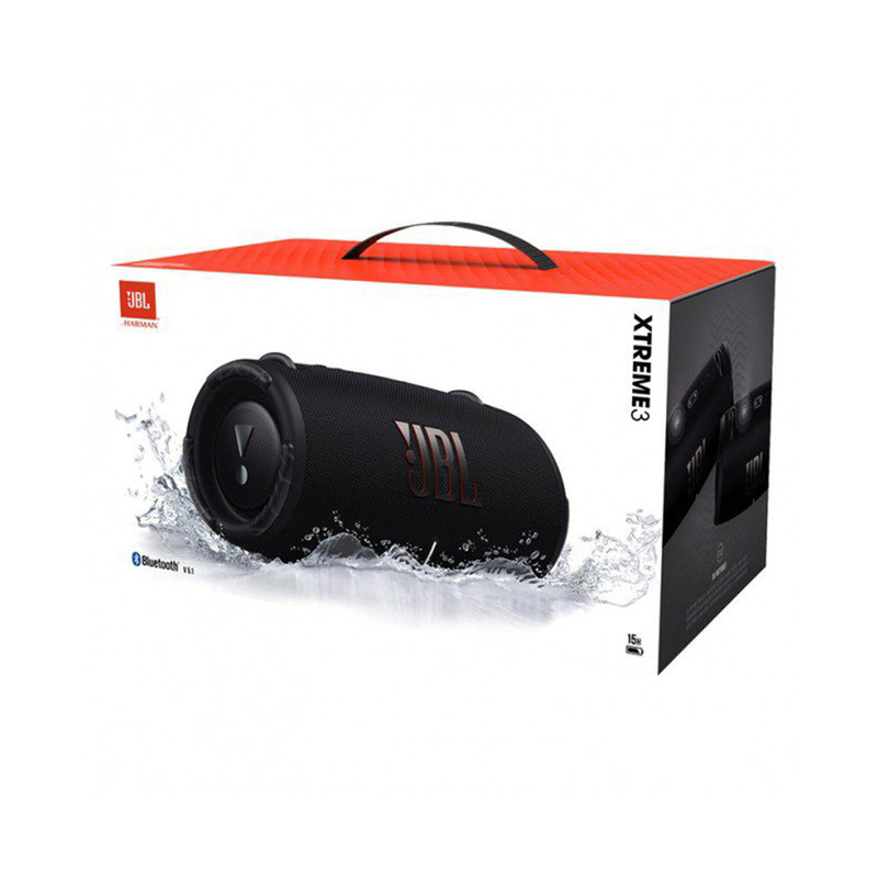 اسپیکر قابل حمل Xtreme 3 نسل سوم اسپیکرهای اکستریم از کمپانی JBL است که دارای ویژگیهای بسیاری است. همچنین دارای طراحی بسیار زیبا و متفاوتی است و به شکل جذابی لوگوی جی بی ال بر روی آن حک شده است. این اسپیکر دارای صدای قدرتمند و شفافی است که توسط دو عدد توئیتر و دو عدد ووفر بهبود یافته تولید میشود ، دو عدد JBL Bass Radiators نیز بیس عمیقی را به صدا اضافه میکند. برای اتصال به این اسپیکر میتوانید از طریق بلوتوث به صورت بی سیم اقدام کنید و یا از طریق کابل AUX بصورت باسیم متصل شوید. بدنهی این اسپیکر با دارا بودن گواهینامه بین المللی IP67 کاملا ضدآب بوده و در برابر نفوذ مایعات و گرد و غبار بسیار مقاوم است. این اسپیکر همراه دارای باتری داخلی قابل شارژ است که قادر است تا 15 ساعت نیروی مصرفی اسپیکر را تامین کند. پاور بانک داخلی آن از طریق پورت USB دستگاههای شما را شارژ میکند ، این ویژگی در مسافرتها یا گردشهای بیرون از منزل بسیار کاربردی است . تکنولوژی اختصاصی JBL PartyBoost امکان اتصال بیش از 100 اسپیکر دارای این تکنولوژی را به یکدیگر فراهم میکند تا قدرت صدای موسیقی را افزایش دهید.