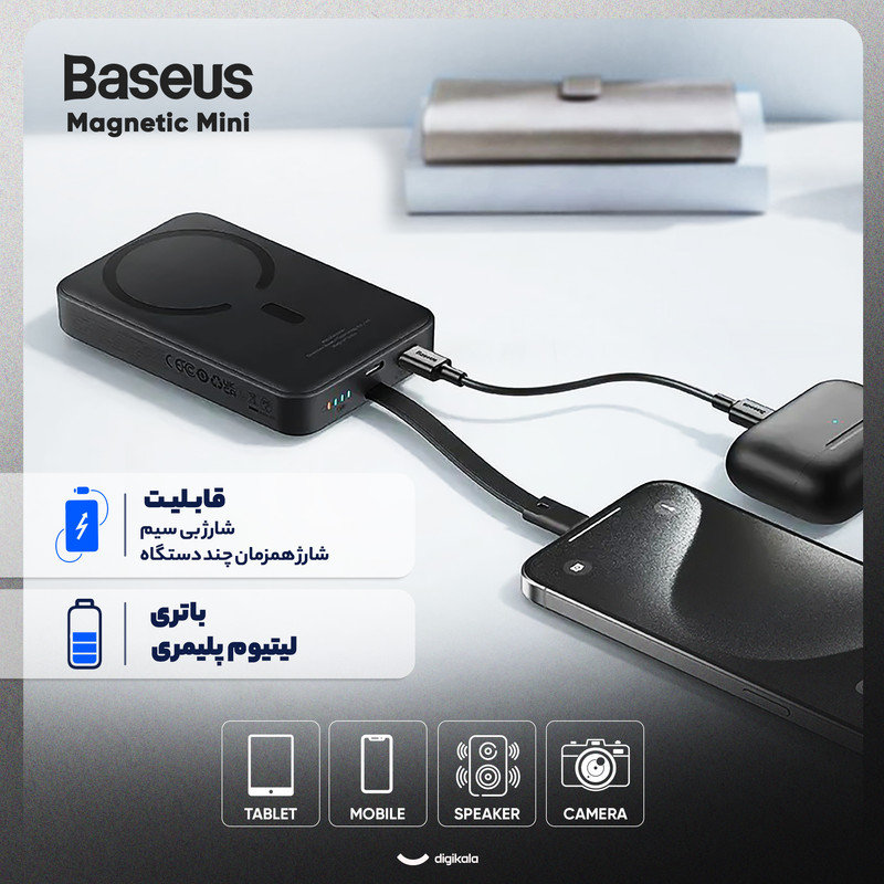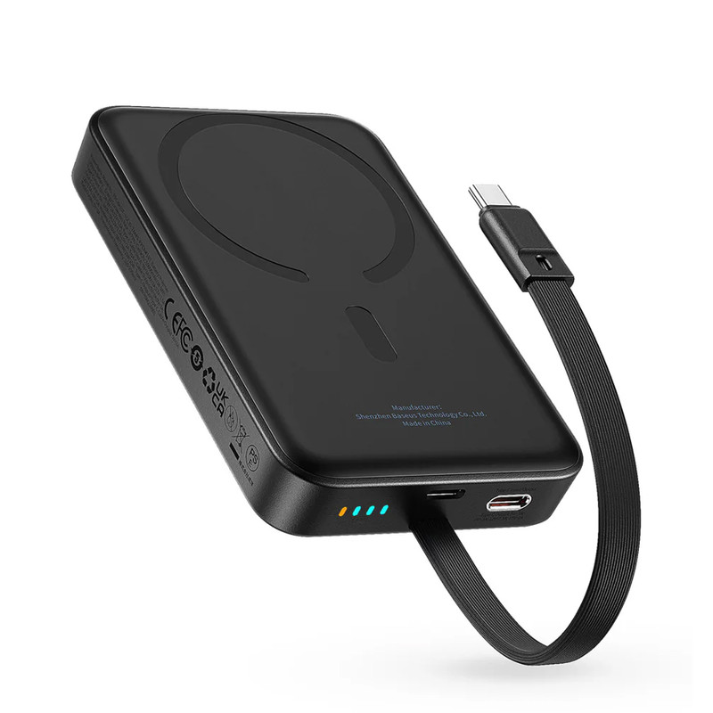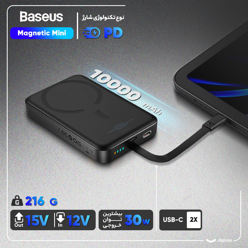 پاوربانک بیسوس مدل Magnetic Mini Wireless 10000mAh با فناوری شارژ بیسیم MagSafe و شارژ سریع 30 وات، همراهی بینظیر برای کاربران مدرن است. این پاوربانک با کابل داخلی USB-C دوطرفه و آهنرباهای قوی (10 نیوتن ≈ 22 پوند)، بهطور ایمن به گوشیهای سری آیفون 15/14/13/12 متصل میشود و شارژ سریع گوشیها، تبلتها و گجتهای USB-C را تضمین میکند. با وزن 216 گرم و طراحی جمعوجور (10.87 × 6.9 × 2 سانتیمتر)، این پاوربانک در رنگ مشکی کلاسیک، استایلی شیک به روزمرگی شما اضافه میکند.