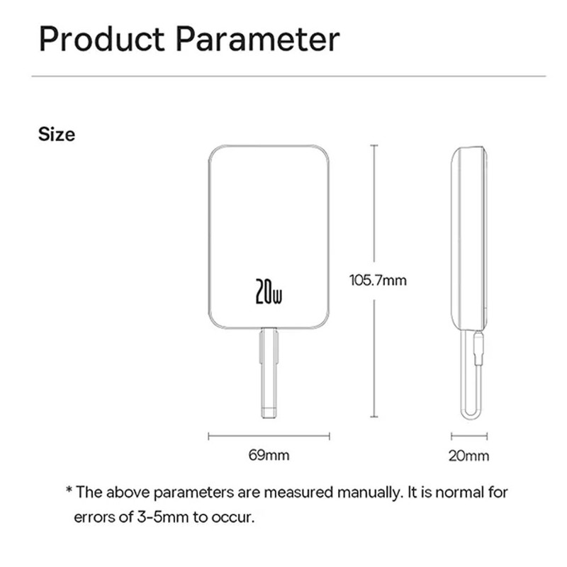 مشخصات فنی: توان خروجی کلی 30 وات / قابلیت شارژ گوشی موبایل و ایرپاد به صورت وایرلس با توان 20 وات / خروجی کابل Type-C 5V⎓3A: 9V⎓3A: 12V⎓2.5A: 15V⎓2A / خروجی درگاه Type-C 5V⎓3A: 9V⎓3A: 12V⎓2.5A: 15V⎓2A /