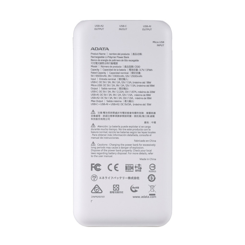 شارژر همراه «ای دیتا» مدل «C100» محصولی نازک، سبک و خوشدست است که با روکش مقاوم روانه بازار شده است. این پاوربانک دارای دو درگاه خروجی USB است و یک ورودی TIPE - C و بدنه مقاوم در برابر حریق دارد. با این مدل پاوربانک می توانید گوشی موبایل را سریعتر شارژ کنید و خود پاوربانک را هم سریعتر شارژ کنید. باتری پاوربانک C100 ظرفیتی معادل 10000 میلیآمپرساعت دارد و از نوع لیتیوم-پلیمر است. در صورت پر بودن این باتری چهار عدد نشانگر روی بدنه پاوربانک روشن خواهند بود. این پاوربانک دارای الگوی پوششی برای مقاومت در برابر سر خوردن و گریپ بهتر است. همچنین مقاوم در برابر اثرانگشت و لکه است. این پاوربانک قابلیت شارژ سه دستگاه به طور همزمان را دارد و از شارژ سریع PD/QC 20 واتی پشتیبانی می کند