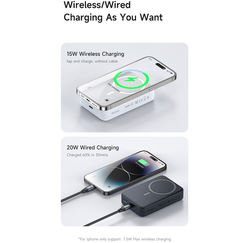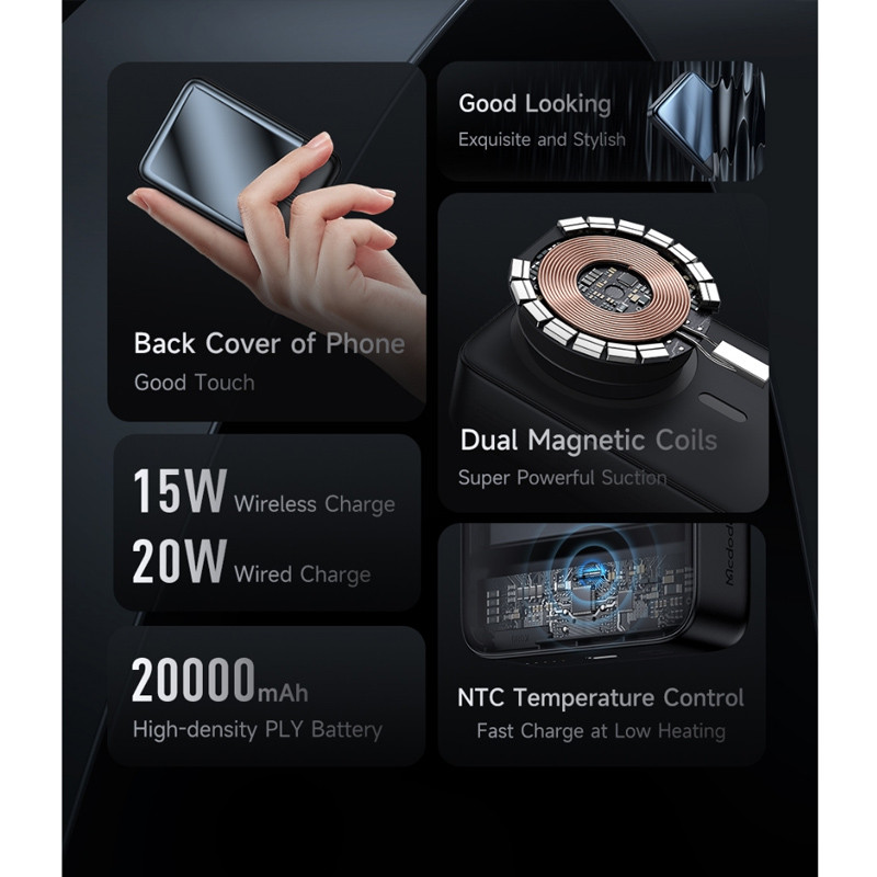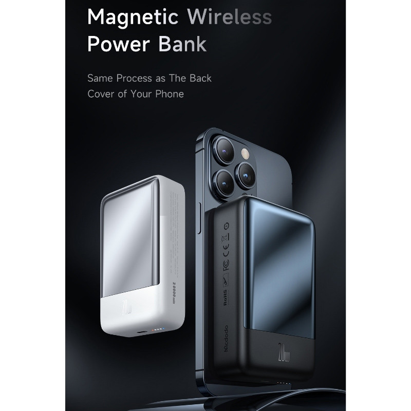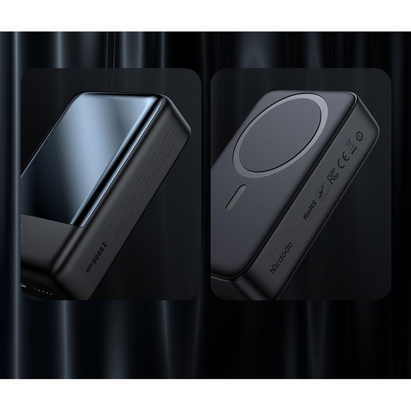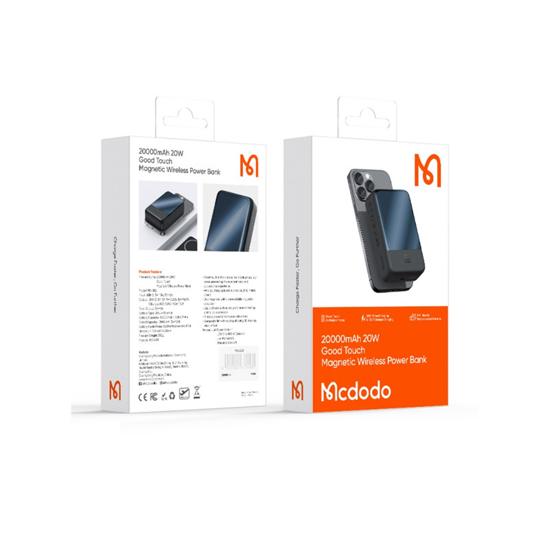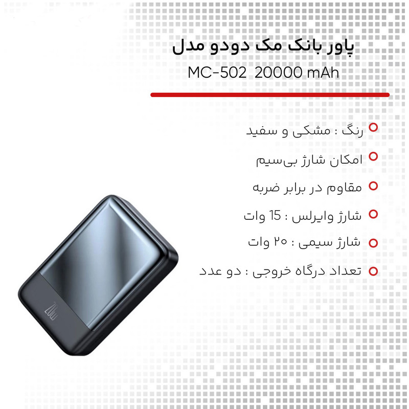 پاوربانک مک دودو مدل MC-502 ظرفیت 20000 میلی آمپر ساعت دارای دو خروجی است که شامل یک پورت Type-c با توان 20 وات و جایگاه شارژ وایرلس با توان 15 وات می شود که پورت Type-C آن به صورت ورودی خروجی عمل میکند. برای استفاده از قابلیت شارژ وایرلس، تلفن همراه شما نیز باید قادر به پشتیبانی از این حالت باشد. این پاوربانک ظرفیت 20 هزار میلی آمپری داشته و علاوه بر تبلت و گوشی تلفن همراه، آن را به محصولی مناسب برای شارژ هندزفری و ساعت هوشمند شما تبدیل می کند.