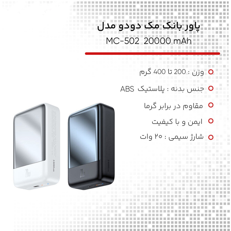 شرکت مک دودو یکی از شرکت های تولید کننده لوازم جانبی موبایل، تبلت و ... می باشد و به تازگی پاوربانک مک دودو مدل MC-502 ظرفیت 20000 میلی آمپر ساعت را طراحی و در بازار عرضه کرده است.
