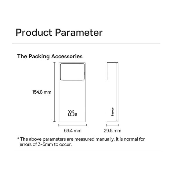 ابعاد پاوربانک برابر 154.8x69.4x29.5 میلیمتر است و وزنی برابر 450 گرم دارد. داخل پک محصول یک کابل Type C به طول 30 سانتی متر با شدت جریان 3A قرار دارد.