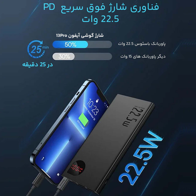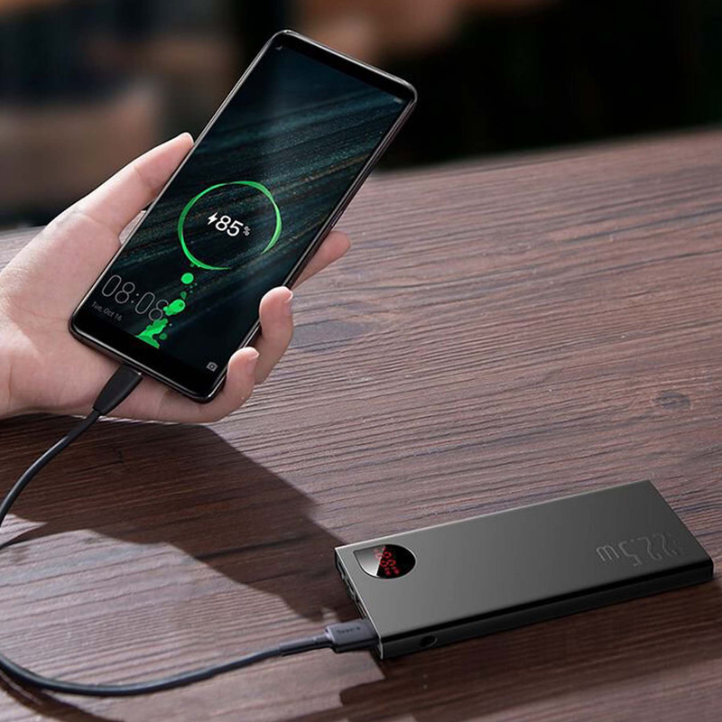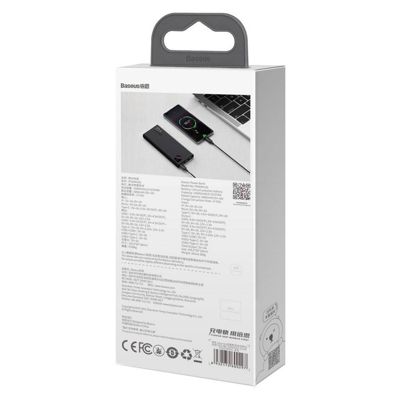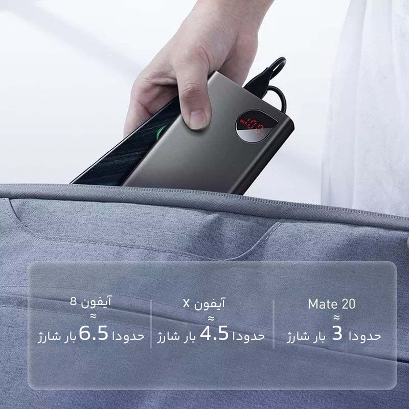 پاوربانک باسئوس Baseus PPAD000001 Adaman Metal Digital Display Quick Charge 5A 2021 Edition PPADM10S دارای سه پورت خروجی است که دوتای آن USB بوده که به شما این امکان را میدهد تا بتوانید دو گوشی را با شدت جریان و ولتاژ 5V-3A شارژ کنید. همچنین این پاوربانک دارای یک پورت تایپ سی است که هم به عنوان یک ورودی و هم خروجی استفاده میشود. این محصول دارای سه پورت ورودی بوده که شامل پورتهای میکرو یو اس بی، لایتنینگ و تایپ سی میباشد و باعث شده تا بتوانید به راحتی با تمامی این کابل ها این پاوربانک را شارژ کنید. ظرفیت اسمی پاوربانک فست شارژ باسئوس Adaman برابر با 10000 میلی آمپر ساعت و ظرفیت واقعی آن 5800 میلی آمپر ساعت است. هر کدام از پورتهایی که گفتیم قادرند توان مشخصی را به شما بدهند. شدت جریان، ولتاژ و توان خروجی هر کدام از پورتهای این پاوربانک عبارت است از: پورت های یو اس بی خروجی: 4.5V/5A (SCP) - 5V/4.5A - 5V/3A - 9V/2A - 12V/1.5A؛ پورت تایپ سی خروجی: 5V/3A - 9V/2.22A - 12V/1.5A؛ پورت یو اس بی 1 + یو اس بی 2: جمعا 5V/3A؛ پورت یو اس بی 1 یا 2 + تایپ سی خروجی: جمعا 5V/3A؛ پورت یو اس بی 1 + یو اس بی 2 + تایپ سی: جمعا 5V/3A؛ پورت تایپ سی ورودی: 5V/3A - 5.5V/3A - 9V/2A؛ پورت میکرو یو اس بی ورودی: 5V/2A - 9V/2A؛ پورت لایتنینگ ورودی: 5V/2A - 9V/2A. این پاوربانک مجهز به یک چیپست هوشمند میباشد که قادر است از باتری گوشی شما در برابر نوسانات و اتصالات کوتاه محافظت کند به گونهای که شدت جریان خروجی از پاوربانک را با شدت جریان ورودی گوشی شما یکسان میکند تا هیچ گونه آسیبی به باتری گوشی شما وارد نشود. پورت های USB این محصول مجهز به فناوری QC 3.0 بوده که از گوشی شما هم دارای این فناوری باشد میتوانید با سرعت بسیار بالا گوشی موبایل خود را شارژ کنید. پورت Type-C هم از فناوری PD برخودار است که به شما امکان شارژ دستگاههایی غیر از گوشی موبایل که در رنج توان این پاوربانک قرار دارند را میدهد. در نگاه اول به این محصول نظر شما به سمت نمایشگر LCD این محصول جلب میشود زیرا طراحی بسیار زیبایی داشته و قادر است میزان شدت جریان، ولتاژ و ظرفیت را به شما نشان دهد. بدنه پاوربانک BASEUS Adaman از پلاستیک ABS و متریال PC بوده که از مقاومت بالایی در برابر خط و خش و ضربه و حرارت دارد.