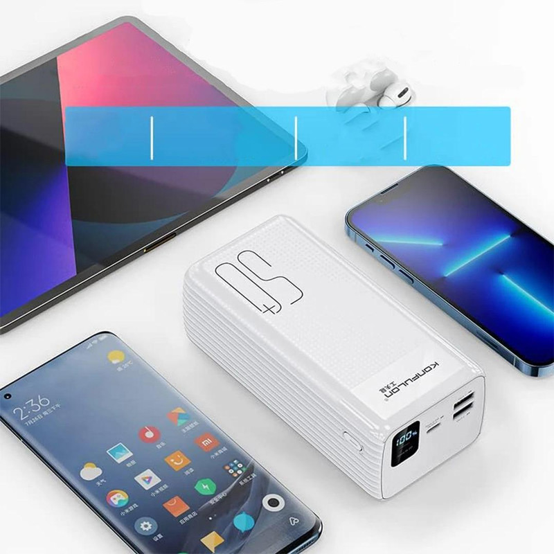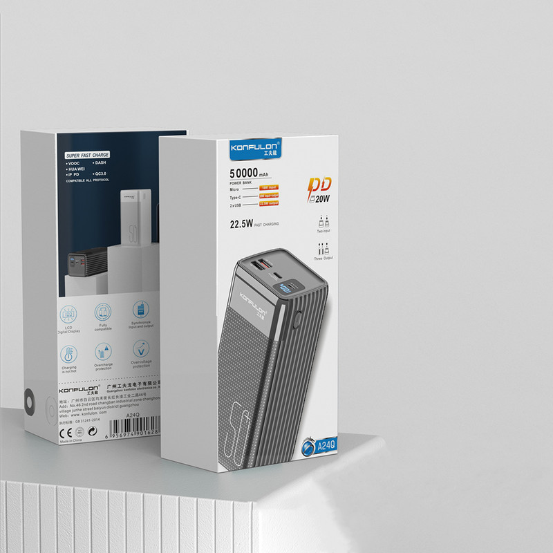 پاوربانک کانفلون Konfulon A24q 50000 یکی از بهترین و قدرتمند ترین پاور بانک های موجود در بازار می باشد . این دستگاه با ابعاد و وزن مناسب ، بسیار جمع و جور بوده و به راحتی در کیف شما حمل می شود . این محصول دارای دو پورت ورودی میکرو یو اس بی با توان 18 وات و تایپ سی با توان 20 وات است . همچنین مجهز به سه پورت خروجی بوده که 2 سوکت ان یو اس بی با توان 22.5 وات و یک سوکت آن Type_C با توان 20 وات می باشد . پاوربانک کانفلون Konfulon A24q 50000 با ظرفیت اسمی 50000 میلی امپر ساعت می تواند انواع گوشی ها ، تبلت ها ، اسپیکر ها ، MP3Player ها ، دوربین های دیجیتال و ... را شارژ کند . روی این پاور بانک یک نمایشگر دیجیتال LCD برای تعیین میزان شارژ ان تعبیه شده است . تا به راحتی از مقدار شارژ دستگاه اگاهی داشته باشید . پاوربانک کانفلون Konfulon A24q 50000 دارای گارانتی و ضمانت یک ساله می باشد. از دیگر قابلیت های منحصر به فرد ان می توان به حفاظت از اتصال کوتاه ، حفاظت از شارژ بیش از حد و محافظت در برابر ولتاژ بیش از حد مجاز اشاره کرد؛ این محصول به گونه ای طراحی شده است که نه تنها اسیبی به موبایل شما وارد نمی کند بلکه از ان محافظت نیز می کند . با خرید این محصول با کیفیت و کاربردی دیگر نگران شارژ سیستم های هوشمند خود نخواهید بود.