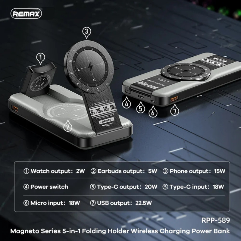 مقدار قبلی: پاوربانک بیسیم **Remax 5 in 1 Magneto Series RPP-589** با ظرفیت 10000 میلیآمپر ساعت، راهحلی کامل برای افرادی است که به دنبال یک شارژر چندمنظوره و بدون دردسر هستند. این پاوربانک با قابلیت شارژ بیسیم مغناطیسی، امکان شارژ همزمان گوشی آیفون تا 15 وات، ساعت اپل تا 2 وات و هدفونهای بیسیم تا 5 وات را فراهم میکند، به این معنی که میتوانید همه دستگاههای خود را بهصورت همزمان و بدون نیاز به کابل شارژ کنید.