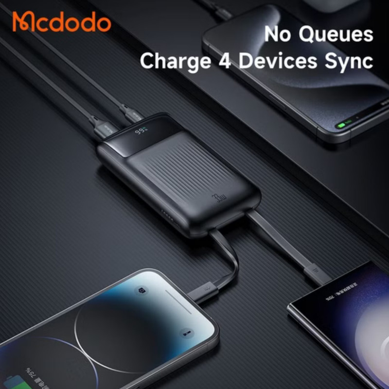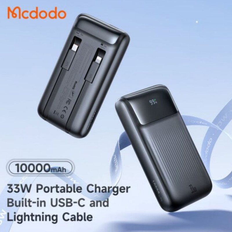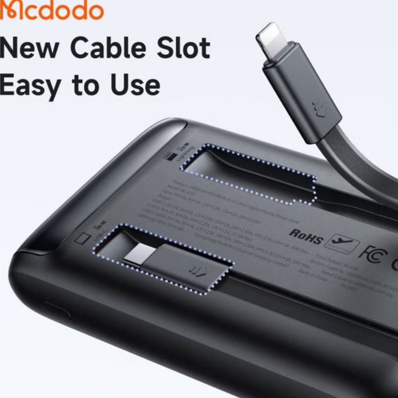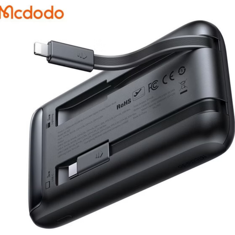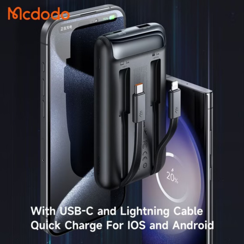 این پاوربانک مک دودو دارای کابل متصل دو سر تایپ سی و لایتنینگ (آیفونی) بوده که شما را از حمل این نوع کابل ها بی نیاز کرده است؛ شما می توانید از این کابل ها به صورت تکی استفاده کنید. شما به صورت کلی می توانید ۳ دستگاه را به صورت همزمان از طریق کابل متصل و درگاه تایپ سی و USB شارژ کنید. قابل ذکز است در صورت استفاده به صورت همزمان از کابل متصل و درگاه ها توان کلی پاوربانک بین آن ها تقسیم خواهد شد. درگاه تایپ سی به صورت ورودی/خروجی قابل استفاده است.