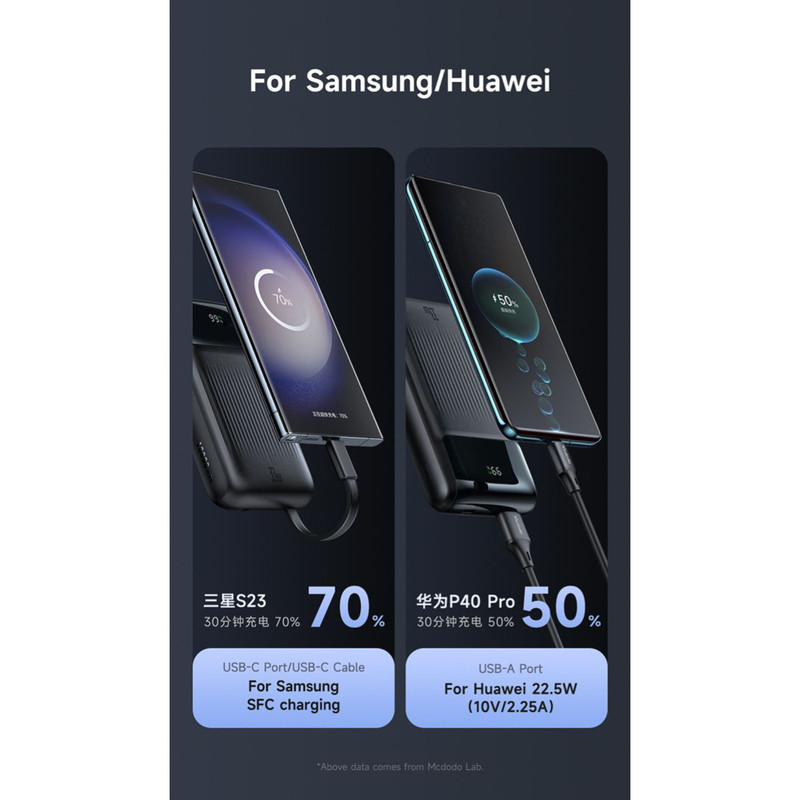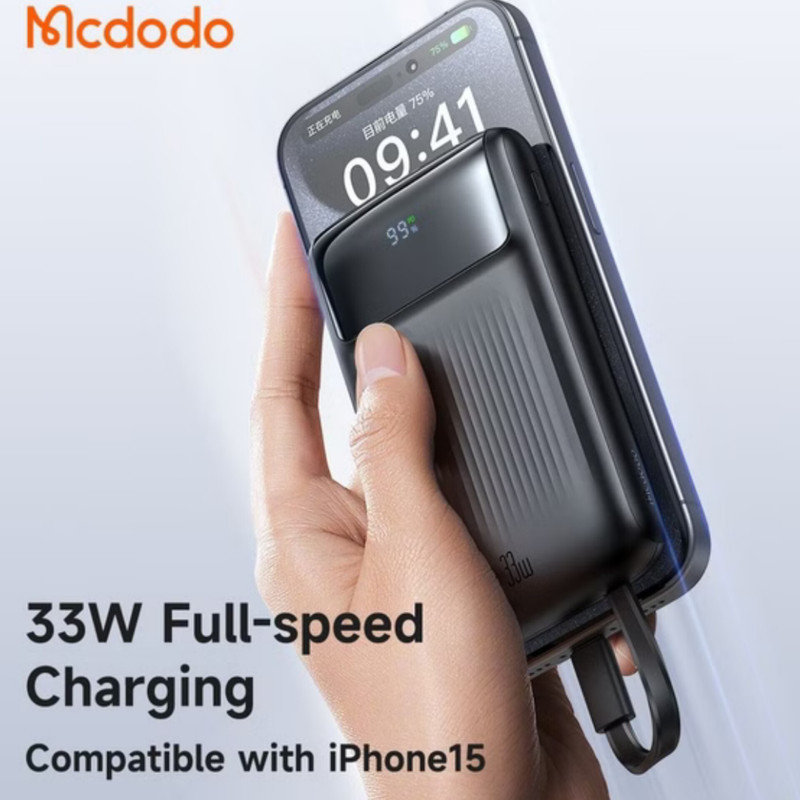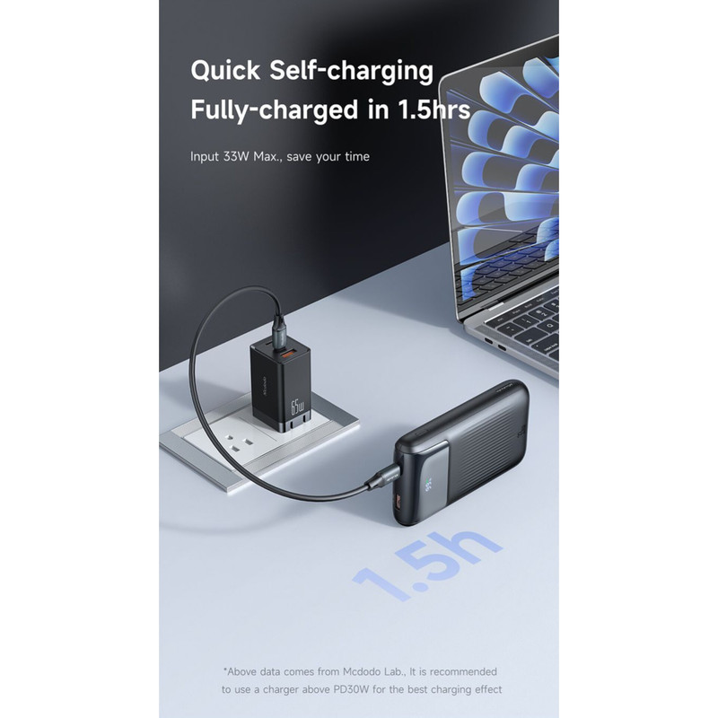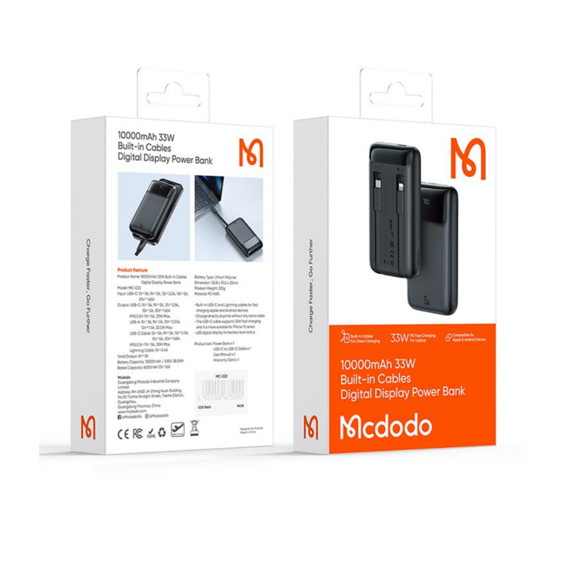 توان کلی این پاوربانک مک دودوبرابر با ۳۳ وات است؛ پاوربانک ۱۰ هزار مک دودو دارای ۲ درگاه در قسمت بالای محصول بوده که درگاه تایپ سی درگاه ورودی/خروجی پاوربانک بوده که برای شارژ پاوربانک و شارژ دستگاه های شماقابل استفاده است؛ توان کلی این پورت برای شارژ شدن خود پاوربانک ۳۳ وات و برای شارژ کردن دیگر دستگاه ها برابر با ۳۳ وات است؛ بعلاوه درگاه USB درگاه خروجی این پاوربانک بوده که دارای توان خروجی کلی ۲۲.۵ وات است که می توانید از طریق این پورت دستگاه های خود را با سرعت بالا شارژ کنید؛ البته باید دستگاه شما نیز از این توان پشتیبانی کند. شما به کمک این پاوربانک میتوانید با بالاترین سرعت ممکن گوشیهای آیفون ۱۴ و ۱۵ خود را شارژ کنید. به نحوی که میتوانید گوشی آیفون ۱۴ و ۱۵ خود را تنها ظرف ۳۰ دقیقه تا ۶۰ درصد شارژ کنید. همچنین گوشیهای میانرده شرکت سامسونگ را نیز میتوانید با بالاترین توان ممکن ظرف تنها ۸۰ دقیقه به طور کامل شارژ کنید.