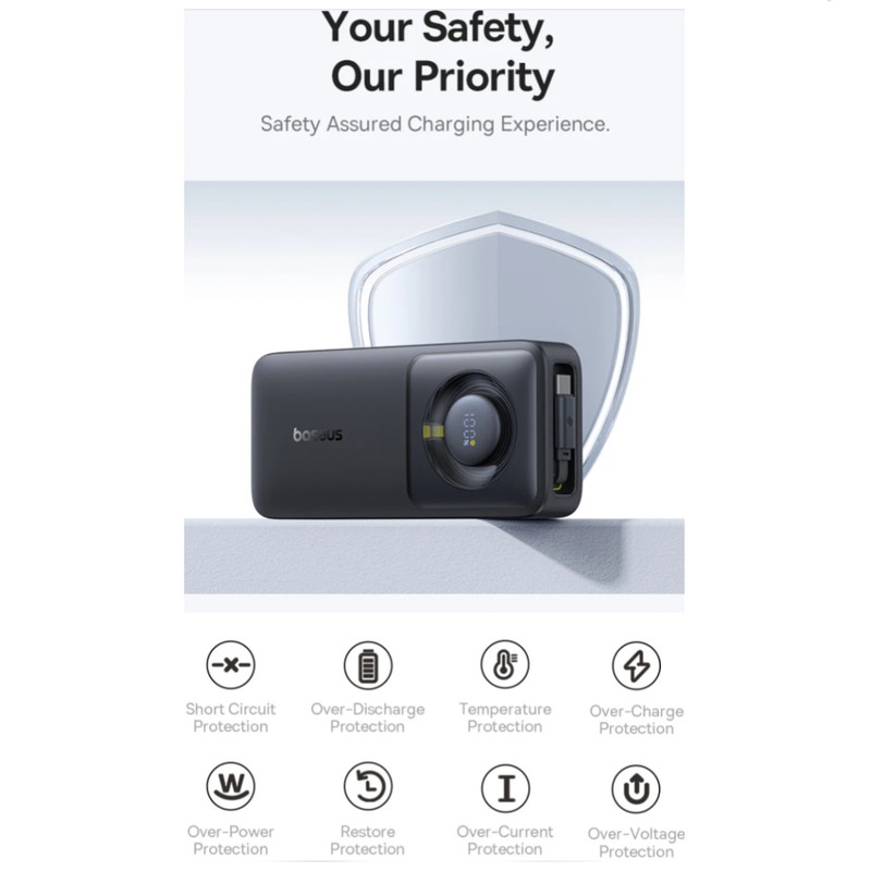 بدنه شارژر پرتابل بیسوس با استفاده از متریال مقاوم در برابر حرارت مانند پلاستیک ABS و پلی کربنات نسوز طراحی شده است، که امنیت بالایی در برابر افزایش دما فراهم میآورد. این محصول به یک صفحه نمایش دیجیتالی مجهز است که به صورت لحظهای اطلاعات مربوط به میزان شارژ باقیمانده را نمایش میدهد. در قسمت بالای دستگاه، یک کابل تایپسی جمع شونده با طول 70 سانتیمتر و کانکتور مغناطیسی قرار دارد که به راحتی به بدنه پاوربانک متصل میشود و از انعطافپذیری بالایی برخوردار است. با ابعاد 155×72×34 میلیمتر و وزن 433.5 گرم، این شارژر به سادگی در دست، جیب یا کیف جای میگیرد و طراحی آن به گونهای است که فضای کمی را اشغال میکند و به راحتی در کنار دیگر وسایل قرار میگیرد.