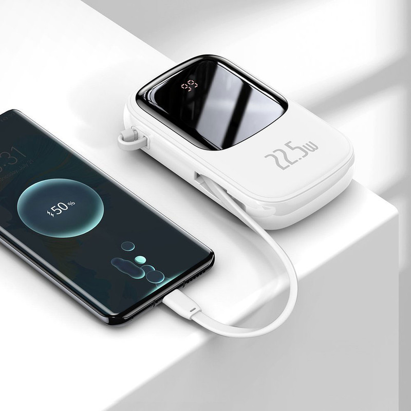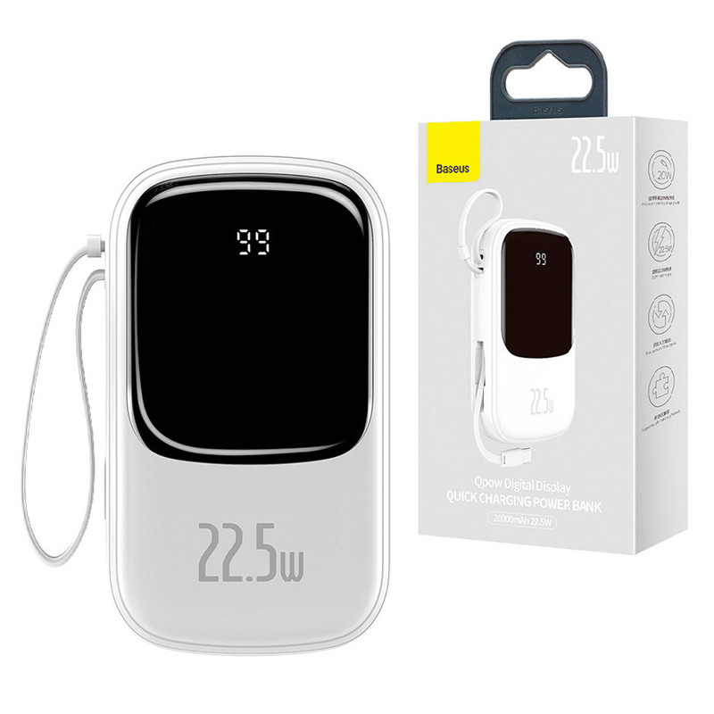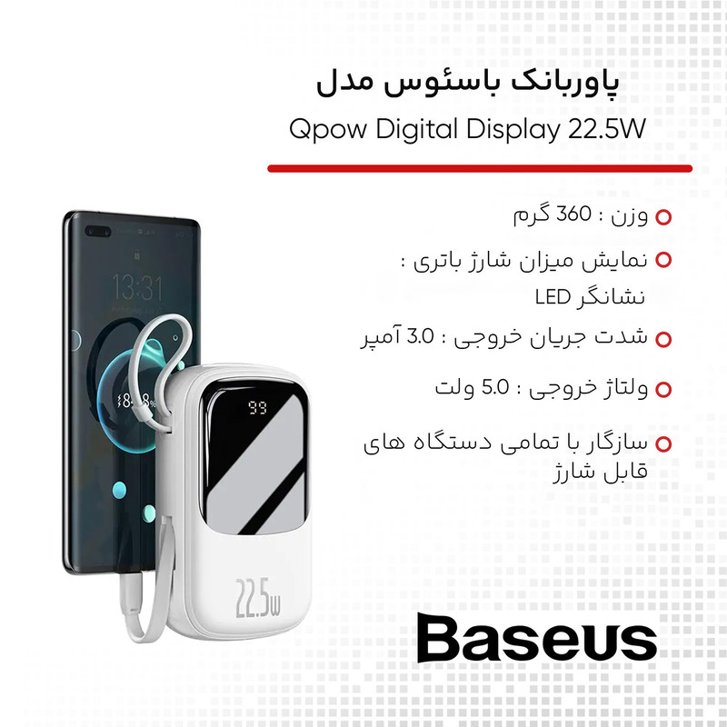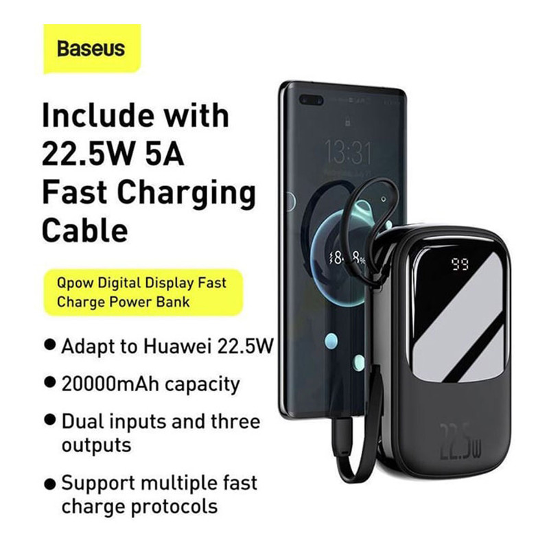 یکی از بهترین پاوربانکهایی که میتوان خریداری کرد پاوربانک Qpow محصولی از کمپانی Baseus است که دارای ظرفیت اسمی 20000 میلیآمپر ساعت است. این محصول دارای سه خروجی است که یکی از آنها پورت USB بوده و به شما این امکان را میدهد تا بتوانید دو گوشی را با شدت جریان و ولتاژ 5V-3A شارژ کنید. همچنین این پاوربانک دارای 1 پورت USB-C است که هم بعنوان ورودی و هم خروجی استفاده میشود. کابل متصل 19 سانتیمتری هم با کانکتور USB-C آخرین خروجی آن به شمار میرود. خروجیهای این پاوربانک از استاندارد شارژ سریع بهره میبرند و میتوانند گوشی شما را را با سرعت بالا شارژ کنند. پاوربانک Baseus مجهز به یک چیپست هوشمند است که قادر است که از باتری گوشی شما در برابر نوسانات و اتصالات کوتاه محافظت کند به گونهای که شدت جریان خروجی از پاوربانک را با شدت جریان ورودی گوشی شما یکسان میکند تا هیچ گونه آسیبی به باتری گوشی شما وارد نشود. بر روی بدنه این پاوربانک نمایشگر دیجیتال قرار داده شده که با فشار دادن دکمه پاور، که قادر است میزان شارژ باتری پاوربانک را به شما نشان بدهد؛ کار شما را برای مدیریت شارژ این محصول بسیار راحت بکند. این امر باعث شده تا در مواقعی که گوشی شما خاموش شده با پاوربانک خالی از شارژ رو به رو نشوید. بدنه پاوربانک از پلاستیک + ABS و فیبر کربن بوده که از مقاومت بالایی در برابر خط و خش و ضربه و حرارت دارد. ابعاد این محصول 32.8×74.6×123 میلیمتر بوده و وزن آن 360 گرم است که برای یک پاوربانک 20000 بسیار مطلوب است.