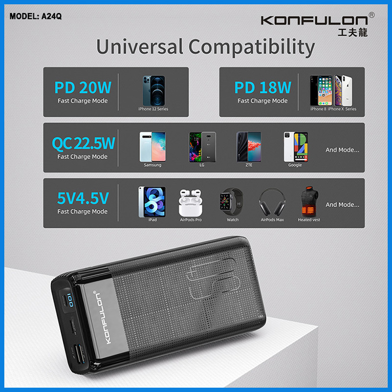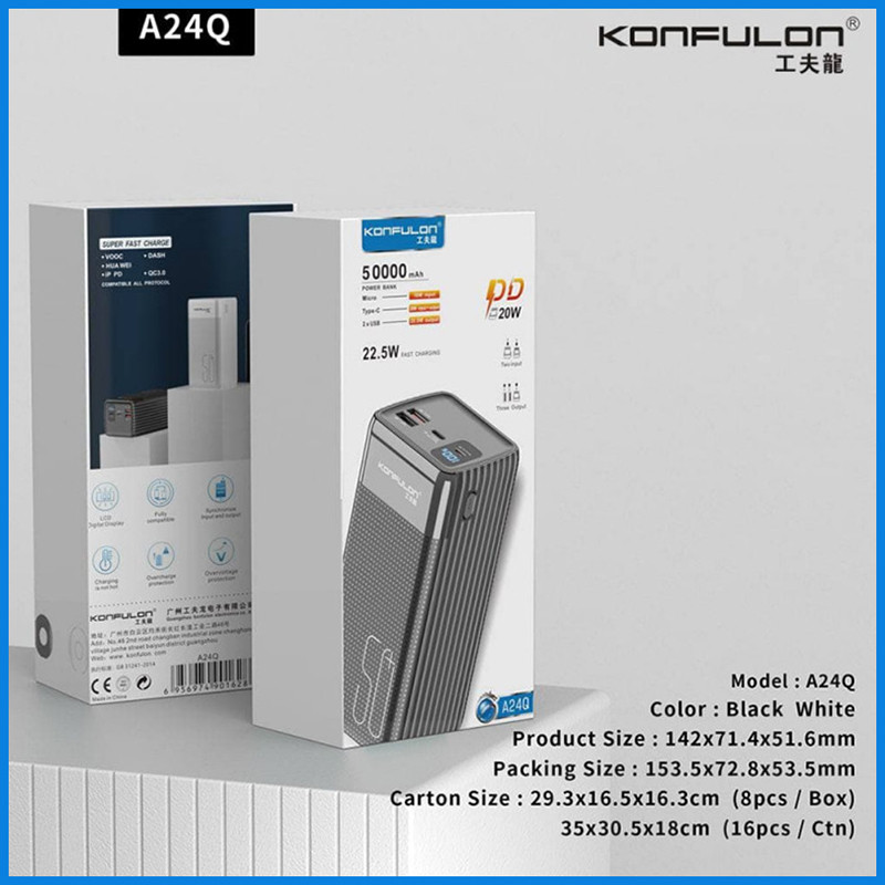 به دلیل تنوع بالای پاوربانکها، همیشه سردرگمی برای خریدار وجود دارد. قصد داریم شما را به زبان ساده، با پاوبانک مدل A24Q از برند کانفلون آشنا کنیم تا انتخاب و خرید مناسبی داشته باشید. تکنولوژی Qualcomm Quick Charge 3.0، طراحی کشیده و بسیار خوشدست، نمایشگر میزان شارژ، دو درگاه خروجی USB، یک درگاه Type-C که هم ورودی و هم خروجیست و یک درگاه ورودی شارژ Micro-USB از ویژگیهای این پاوربانک است. سیستم کنترل کننده هوشمند نوسانات برق، جلوگیری از ولتاژ و شارژ اضافه و قطع کردن اتوماتیک روند شارژ پس از پر شدن (جهت کنترل سلامت باتری) قابل اشاره و پراهمیت میباشد. ماکزیمم توان خروجی این مدل 22.5 وات و ظرفیت اسمی 50000 میباشد. مشخصات دقیقتر را در عکسها قرار دادیم و توصیه میکنیم به آنها نیز توجه نمایید.