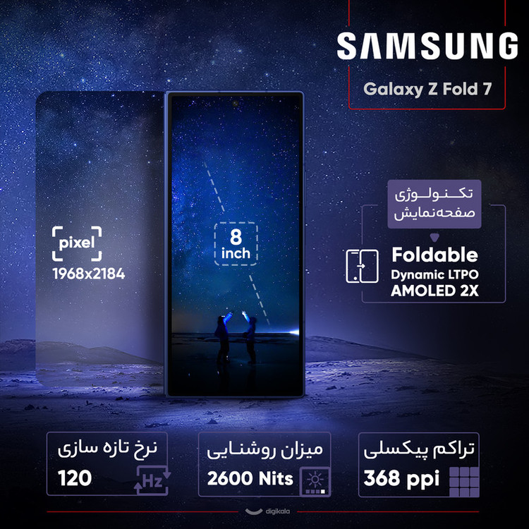 ابعاد : در حالت باز 158.4x143.2x4.2 - در حالت تا شده 158.4x72.8x8.9 میلیمتر