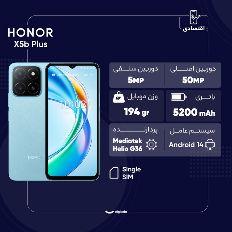 گوشی Honor X5B Plus یکی از جدیدترین میانردههای برند آنر است که در اواخر سال 2024 به عنوان یک دستگاه اقتصادی و کاربردی معرفی و عرضه شد. این گوشی با طراحی ساده، وزن 194 گرم و لبههای خمیده گوشی خوش دستی محسوب میشود. صفحهنمایش 6.56 اینچی TFT LCD با نرخ تازهسازی 90 هرتز، روشنایی 530 نیت و رزولوشن 1612x720 پیکسل تجربه بصری قابل قبولی را در اختیار کاربران میگذارد. با این حال، تراکم پیکسلی 269ppi و رزولوشن HD+ ممکن است برای کاربرانی که به کیفیت تصویر بالاتر نیاز دارند، محدود باشد. پردازنده Mediatek Helio G36 با فناوری 12 نانومتری و پردازنده گرافیکی PowerVR GE8320 برای کارهای روزمره و بازیهای سبک مناسب است. این گوشی با حافظه داخلی 128 و حافظه رم 4 گیگابایت عرضه شده است و از کارت حافظه microSD نیز پشتیبانی میکند. دوربین اصلی 50 مگاپیکسلی با دیافراگم f/1.8 عکسهایی مناسب در شرایط نوری خوب ثبت میکند. این دوربین امکان فیلمبرداری Full HD دارد که مزیت مهمی محسوب میشود. دوربین سلفی این گوشی رزولوشن 5 مگاپیکسلی دارد که کاملا اقتصادی است و برای تماسهای ویدیویی و سلفیهای ساده میتواند کارایی داشته باشد. باتری 5200 میلیآمپرساعتی ماندگاری خوبی دارد، اما شارژر 10 واتی ممکن است زمان شارژ را طولانیتر کند. با سیستمعامل Android 14 و رابط کاربری Magic OS 8، این گوشی تجربهای مدرن و بهروز را ارائه میدهد و با پشتیبانی از دو سیمکارت نانو، گزینهای مقرونبهصرفه برای کاربرانی که به دنبال یک گوشی اقتصادی هستند، محسوب میشود.