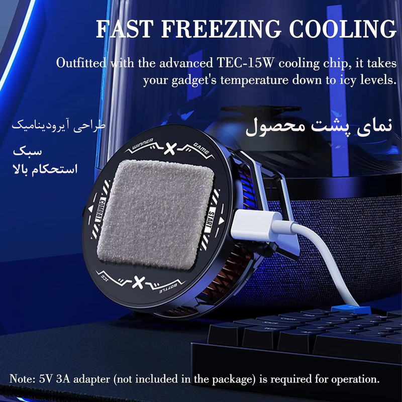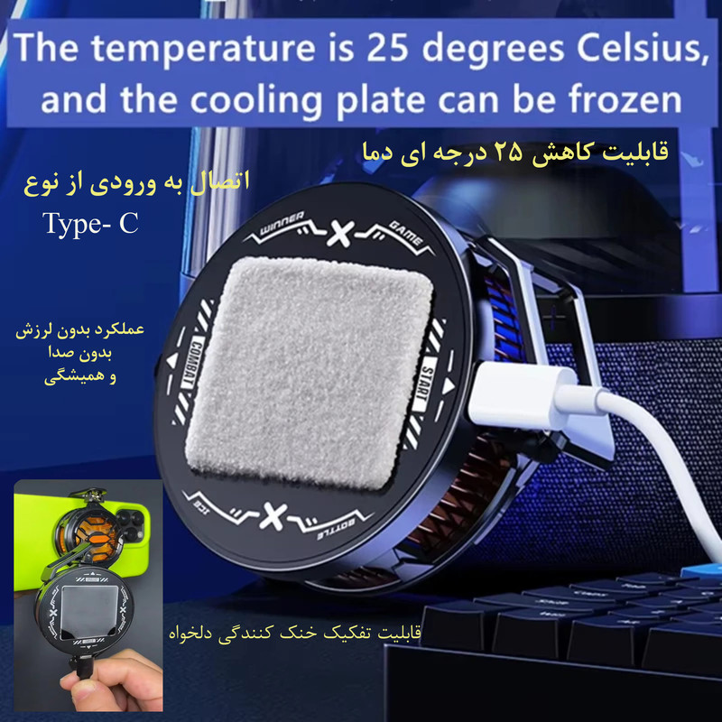 پنل انجماد متمرکز و چیپ TEC-15W میتواند تا 25 درجه کاهش دما ایجاد کند و باعث خنککنندگی سریع و یکنواخت گوشی میشود. با سطح نویز 25دسی بل، مزاحمت صوتی برای شما ایجاد نمیکند و از محصولات مشابه کم صداتر است. پوسته قابل باز شدن، امکان دسترسی راحت به فن داخلی برای تمیز کردن را فراهم میکند. طراحی گیمینگ با نور هفت رنگ، تجربه کاربری شما را ارتقا میدهد. همچنین به علت داشتن گیره برای تمام سایز های گوشیهای همراه مناسب می باشد.